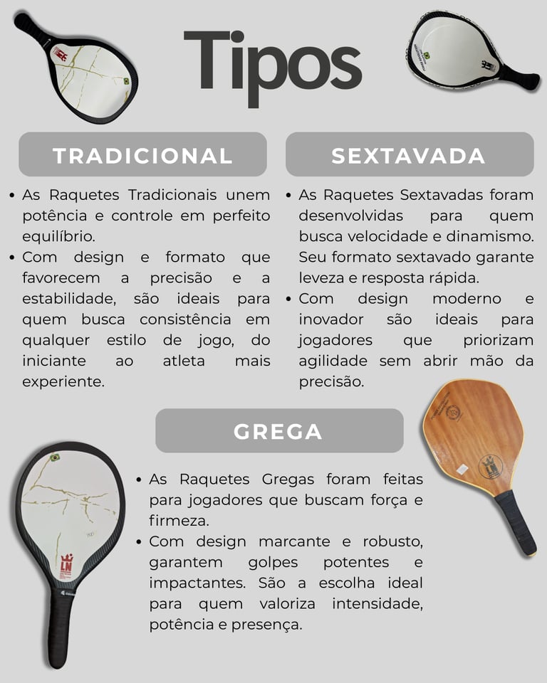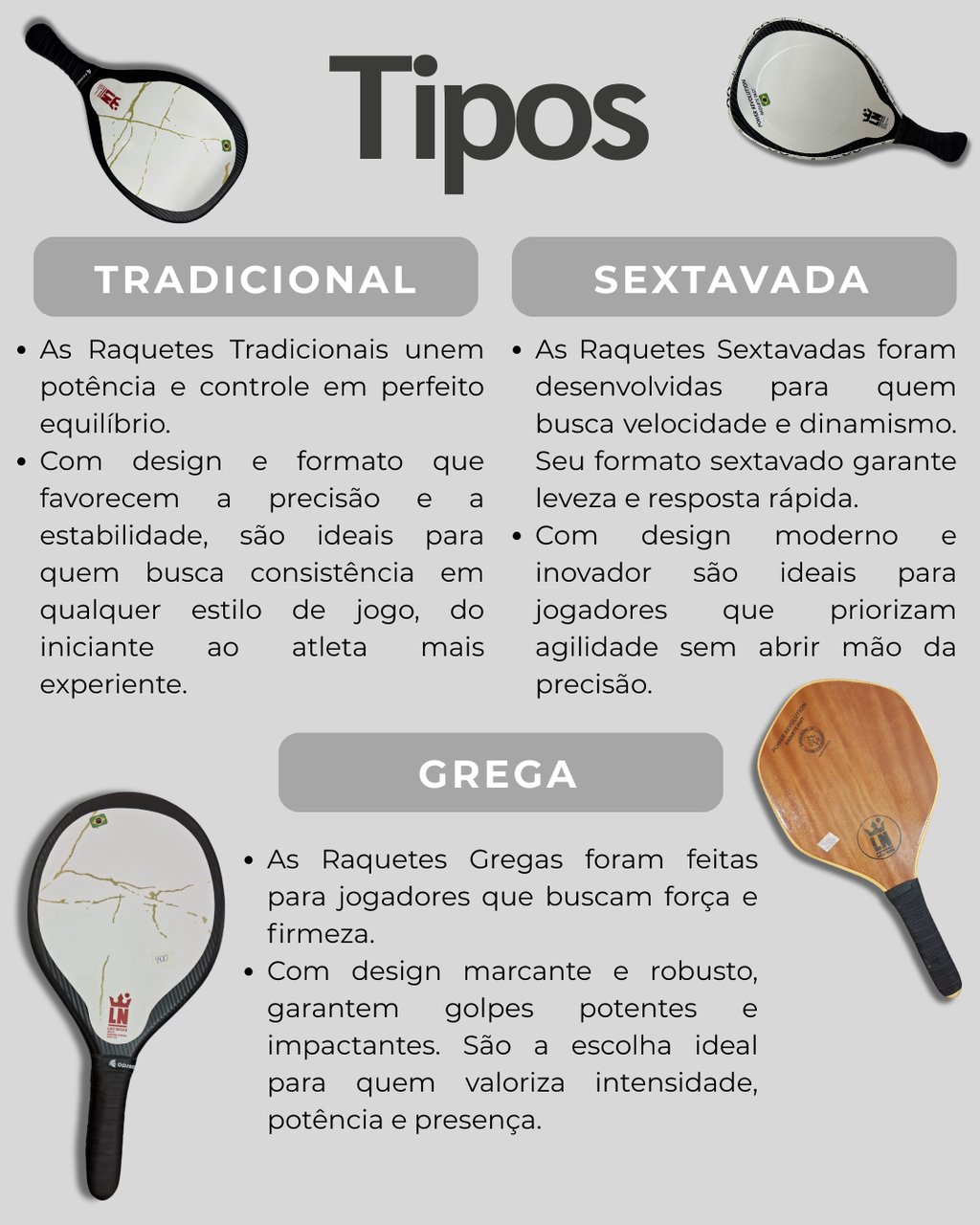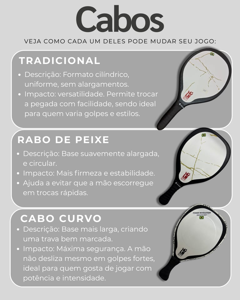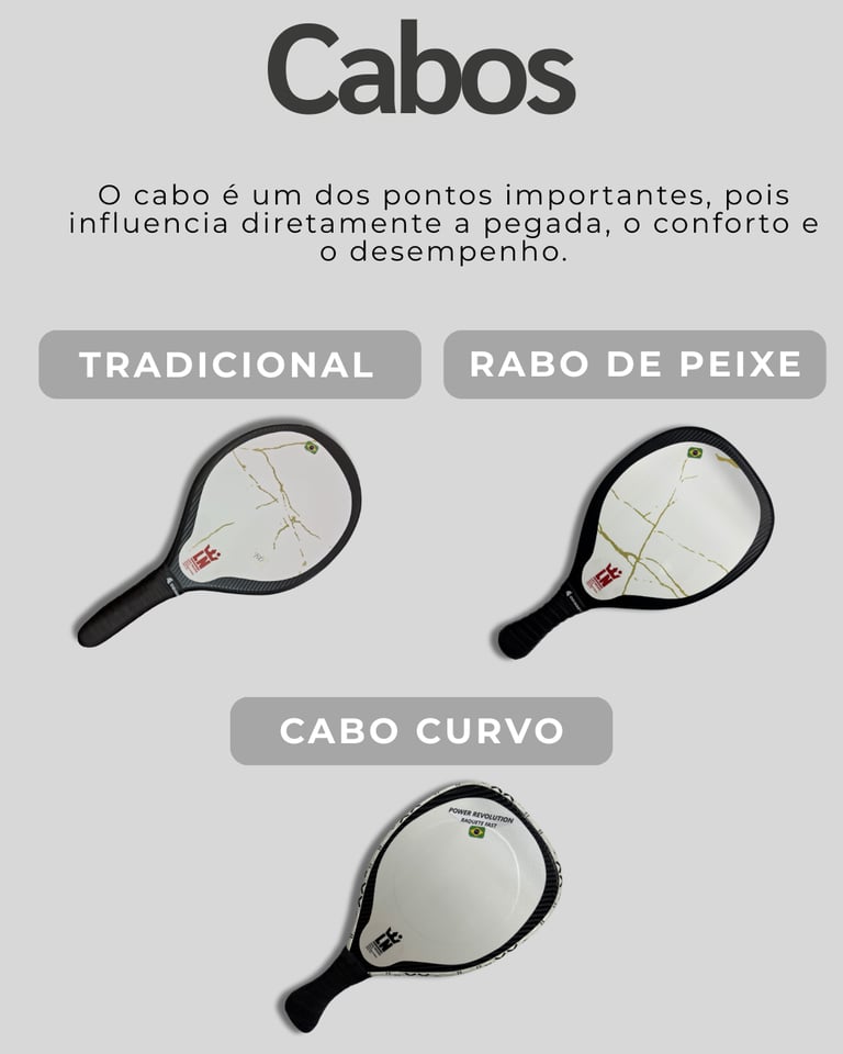 Aqui você vai descobrir o que cada modelo de raquete e cada tipo de cabo representam, para escolher a opção ideal para você.